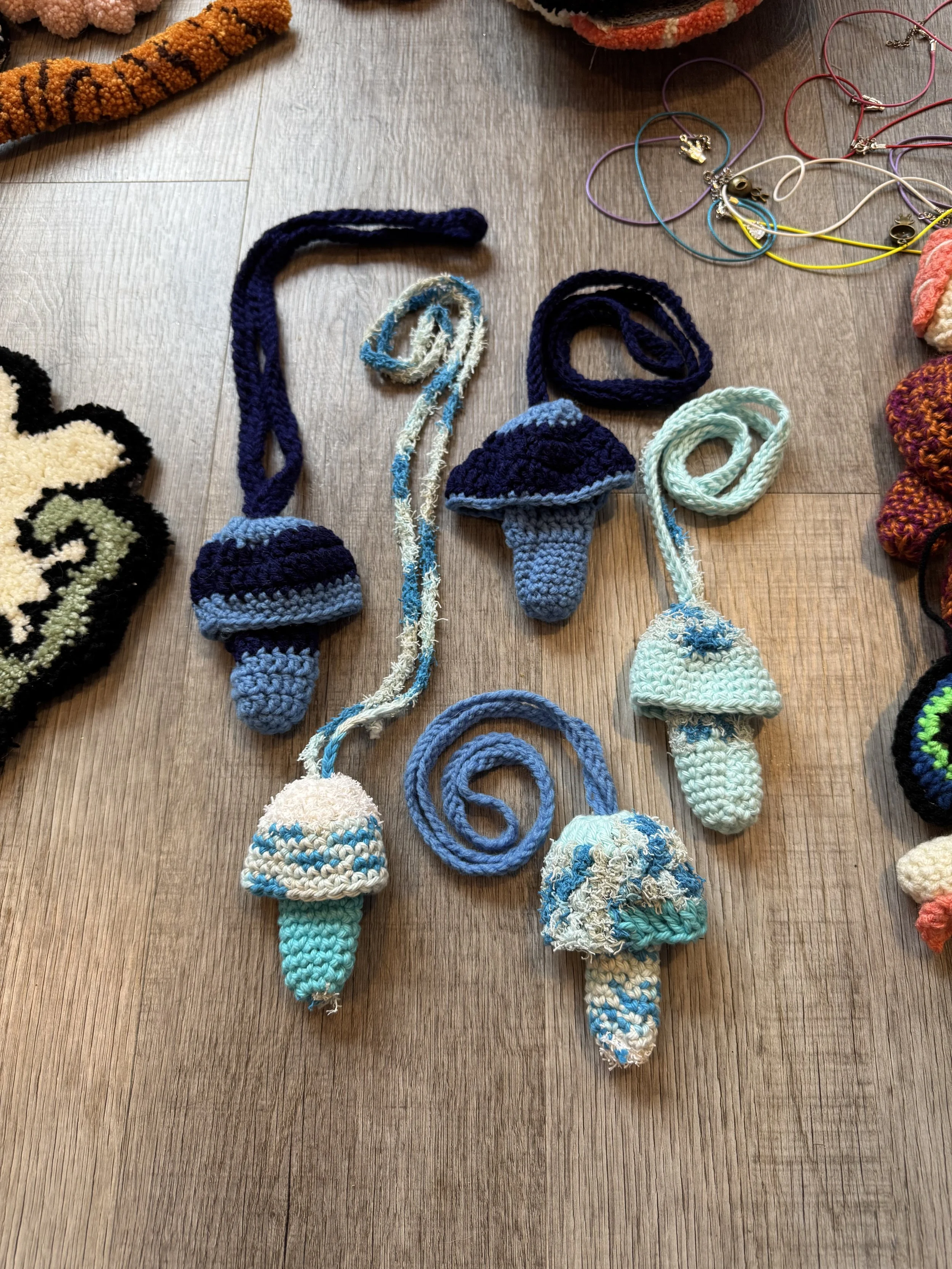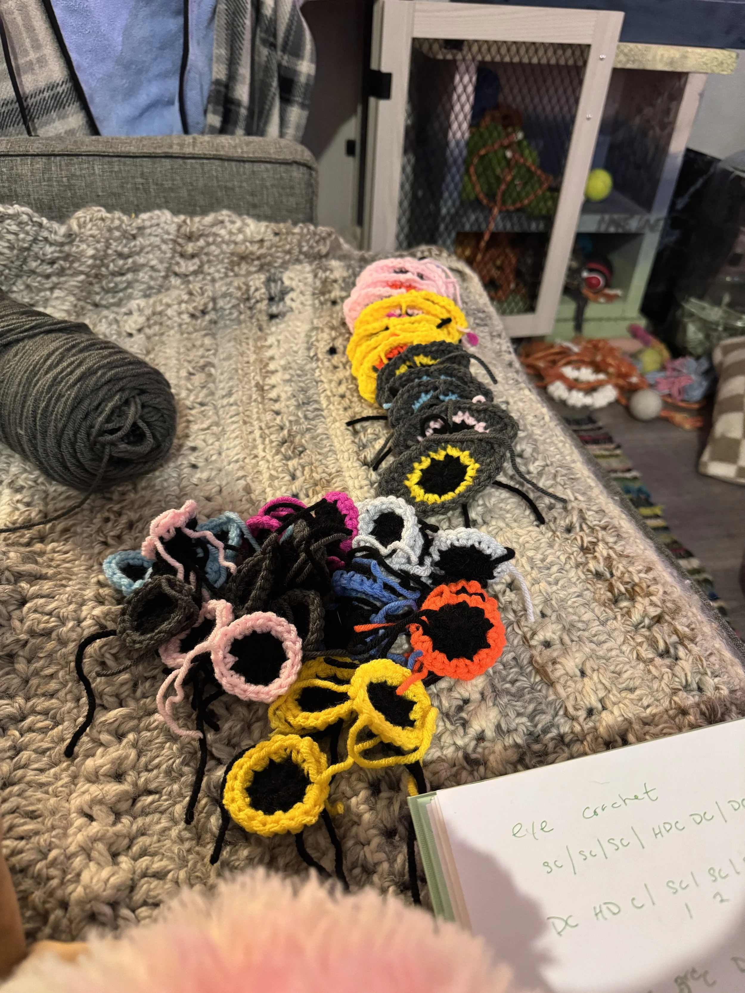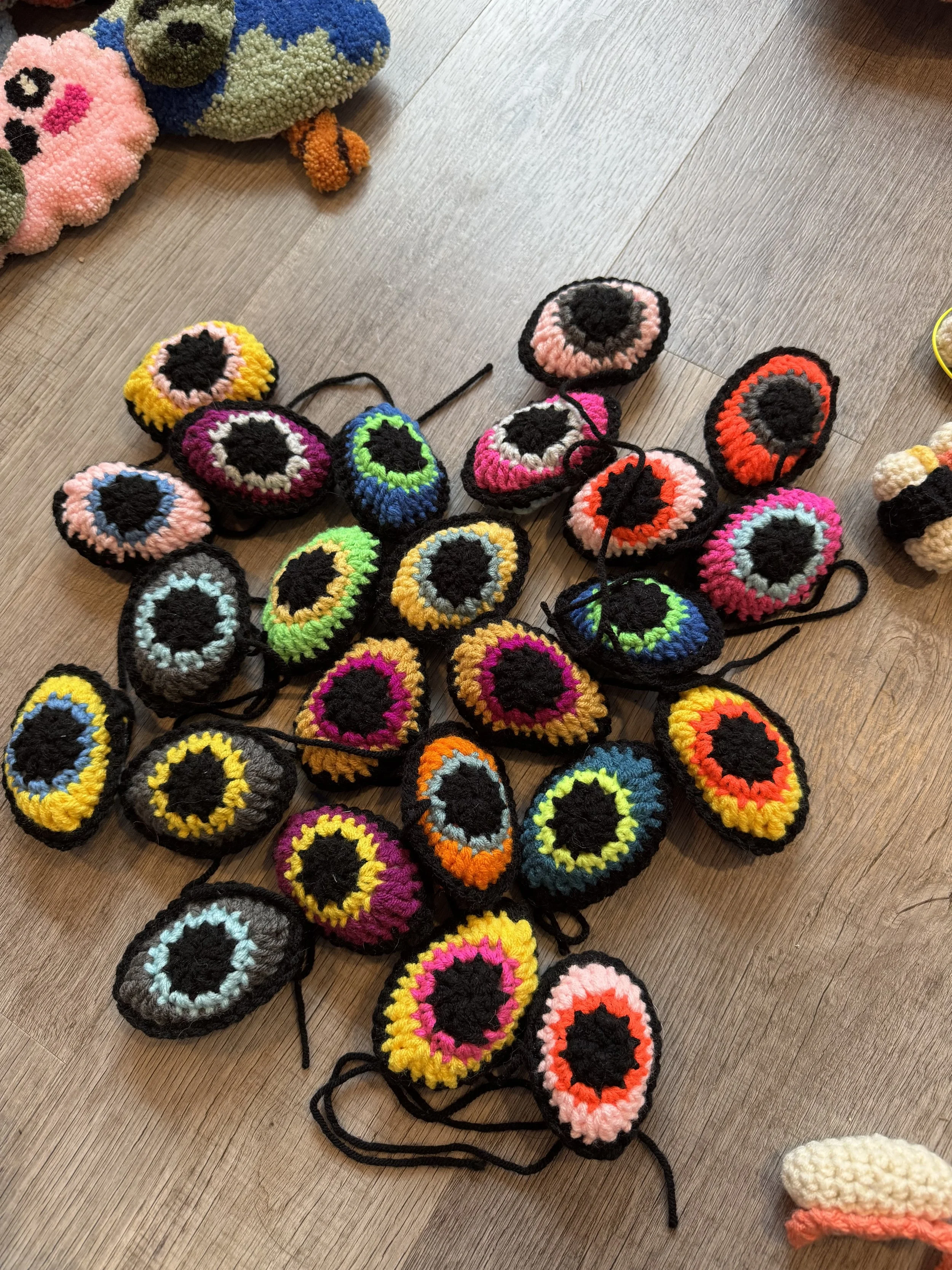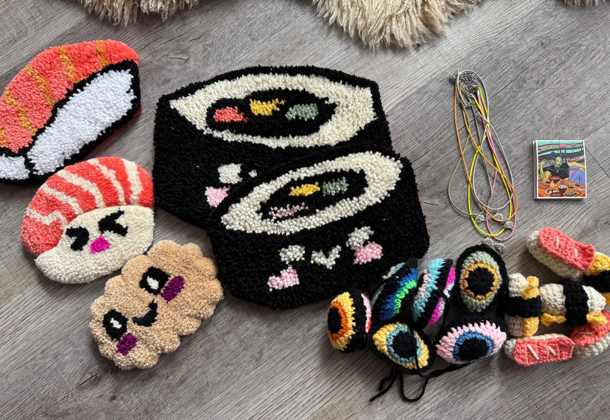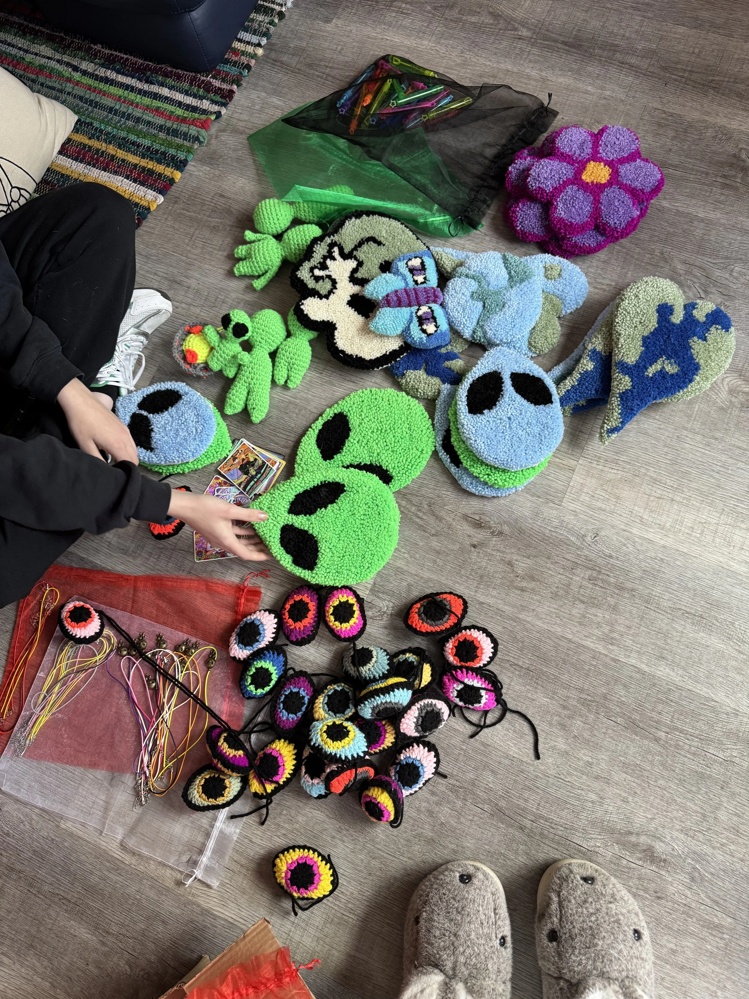 Tiny baby sushi fluffs $10.00 Squishy eyeballs crocheted $10.00 Skater Gurl Rug $120.00 Weed jar yarned up $75.00 Joints by way of yarn $42.00 I believe in hoomans $25.00 The witchening fluffs $25.00 Mushroom pouches $25.00 Grab Bag $100.00 Commissioned Piece $150.00 Pagan Halloween Bag $35.00 "I Believe In Humans" Halloween Bag $30.00 Sushi rugs $35.00 Baby Blanket $175.00 Sold out